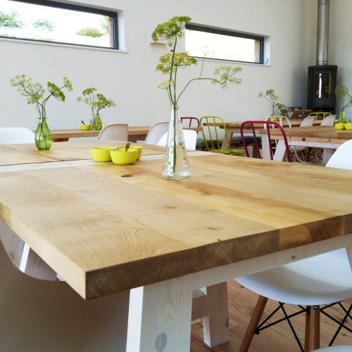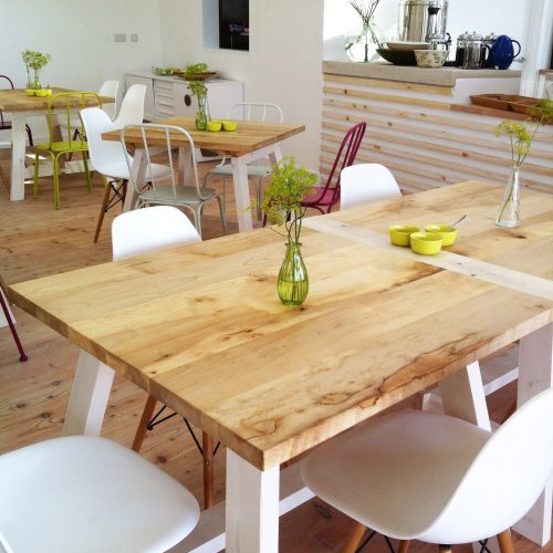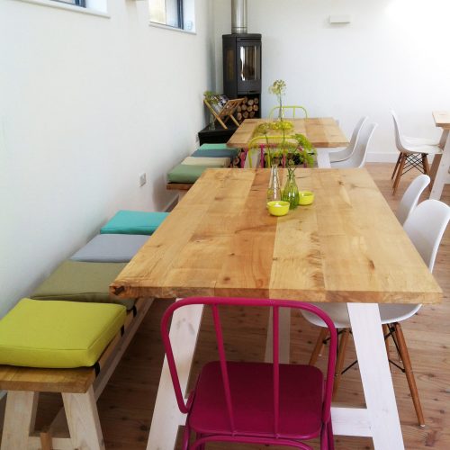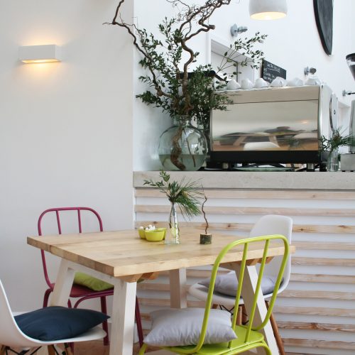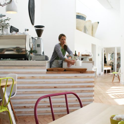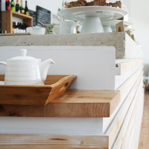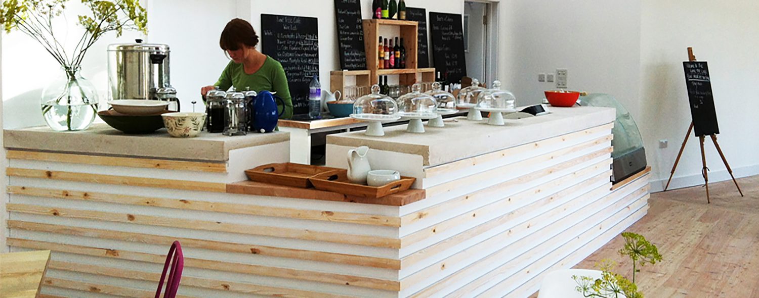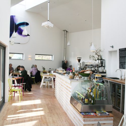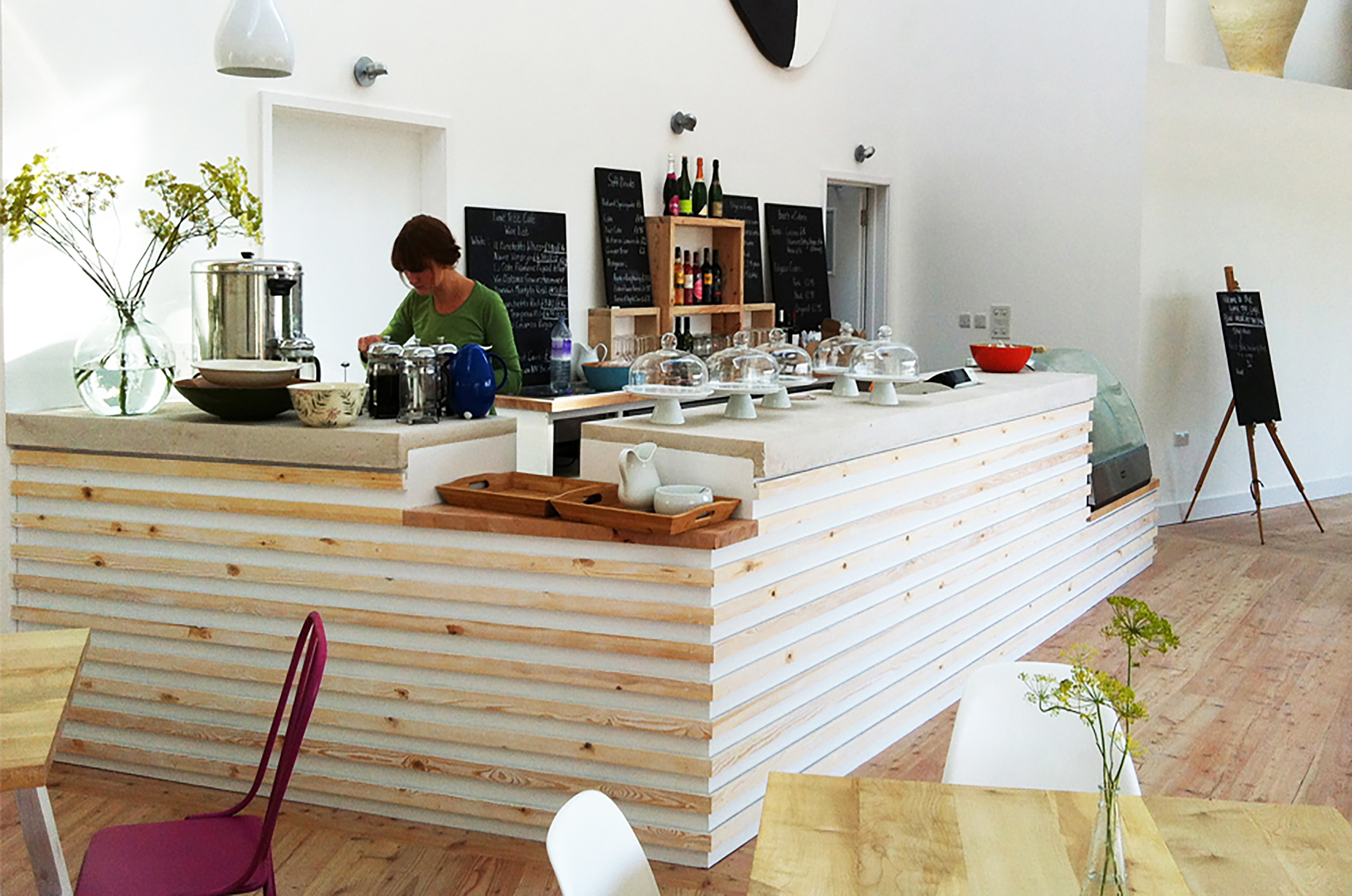 Natural light is harnessed to enhance the environment, giving the cafe a gallery quality. The main counter was formed on site using douglas fir strips set in to a cast concrete unit and this gave the cafe a sculptural feel. Bespoke locally sourced light timber tables, long benches, white walls and pockets of lime greens and yellow colours gave the space a tranquil feel allowing customers to relax, reflect and socialise.