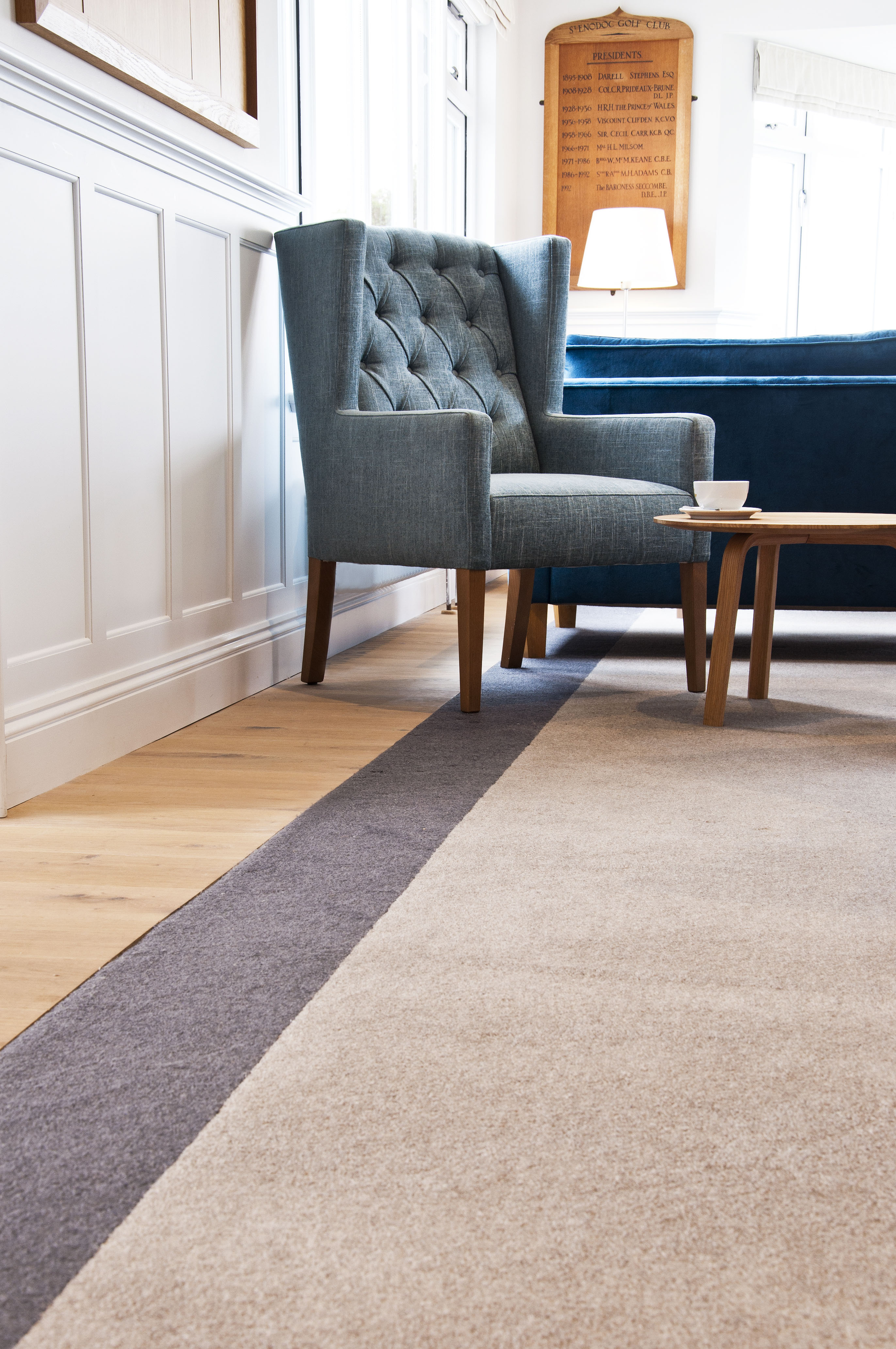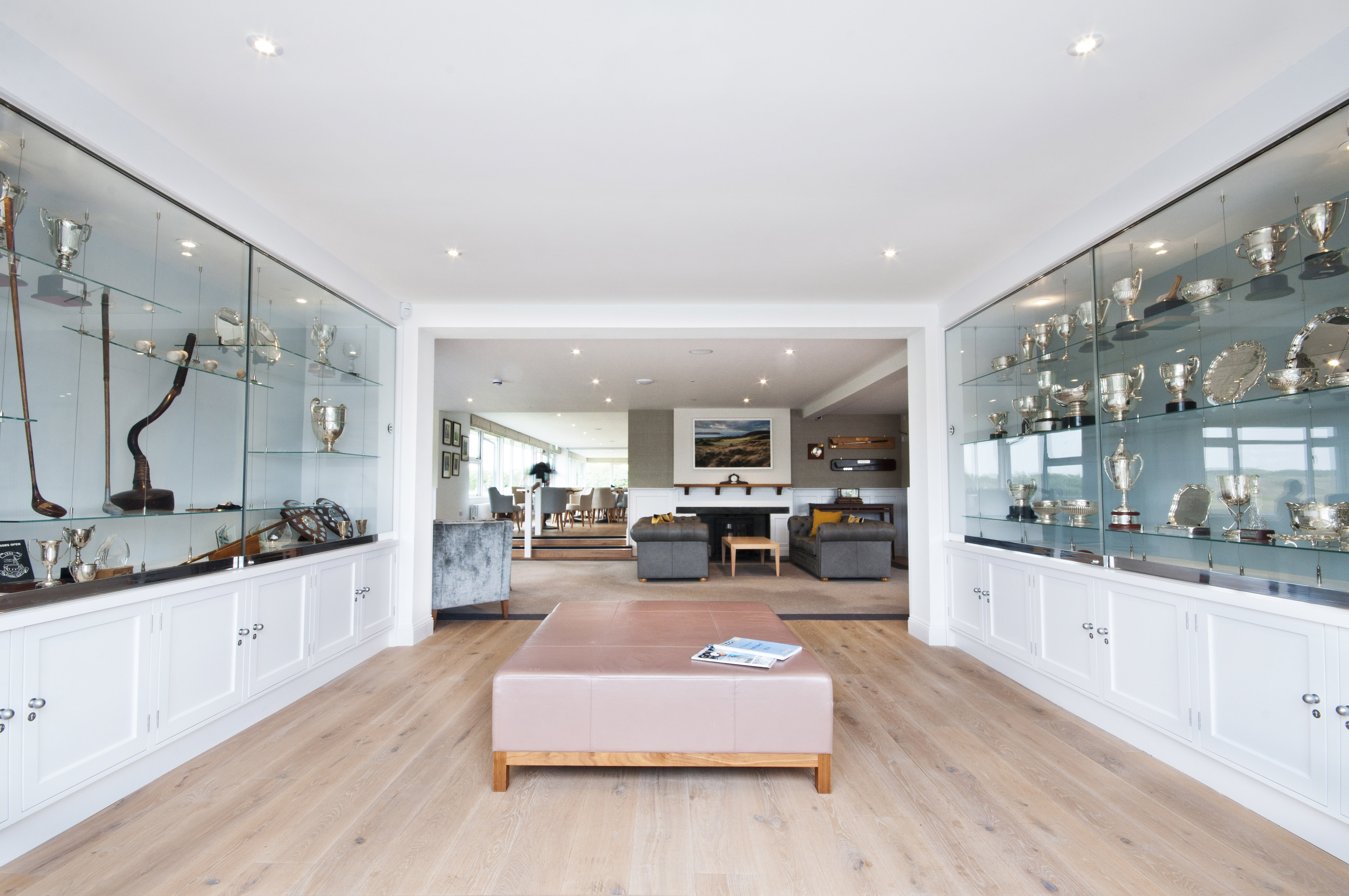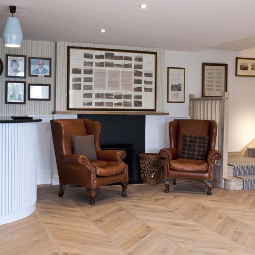 By introducing panelling, herringbone oak flooring, picture lighting and textured and striped wall papers, the decoration has a timeless and classic feel. The main reception is now a welcoming space, with leather high back chairs either side of the fireplace. The new reception desk mirrors the new bar design with slatted bleached timber and a granite top. We created a new secondary entrance with bespoke joinery cabinets displaying trophies and awards for the enjoyment of the members. A large upholstered bench in the centre of this space gives the members another place to socialise.