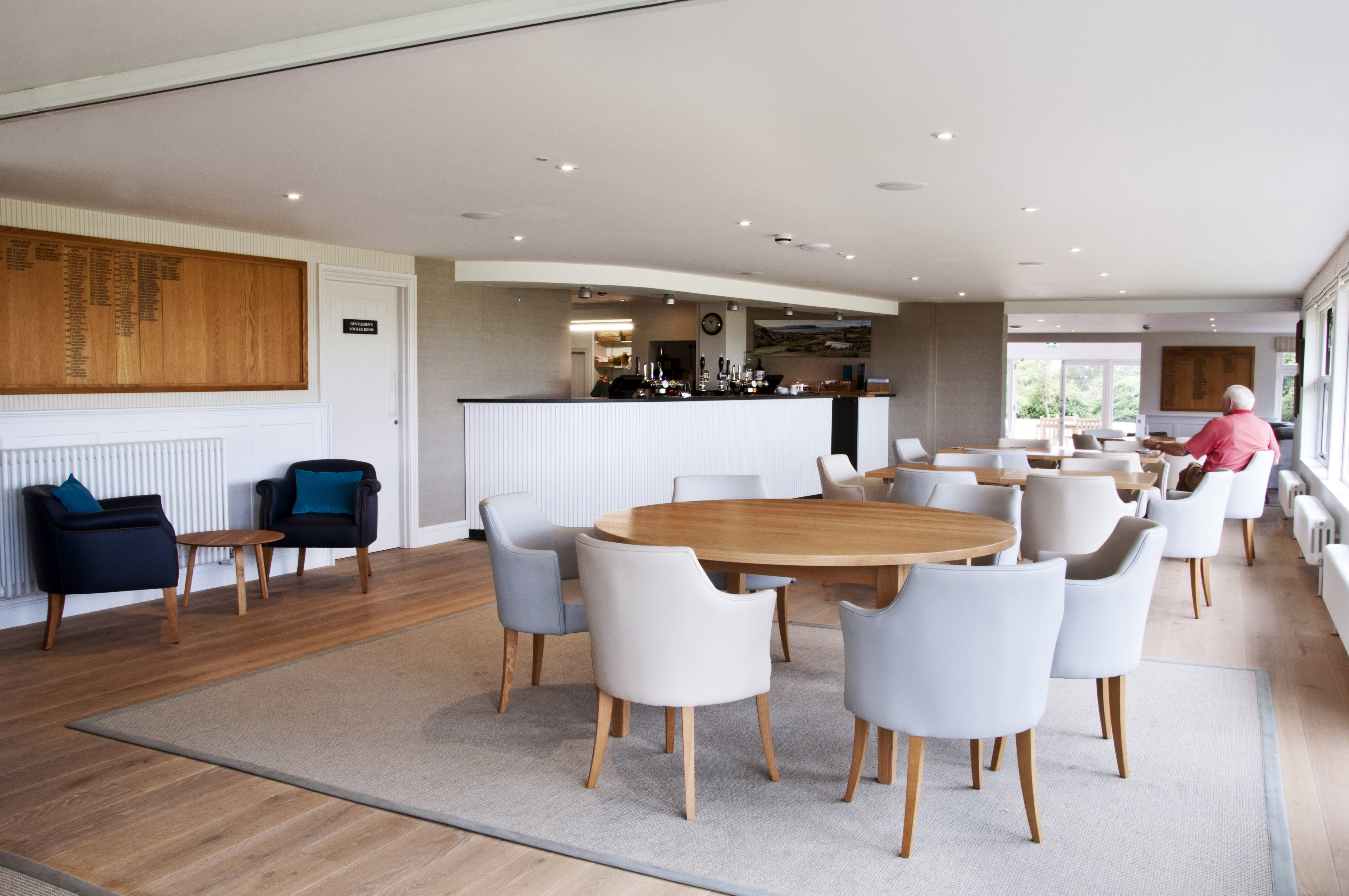By removing structural elements we could open the space and using the same materials we connected the lounge to the bar. The newly designed bar curves towards the lounge and a mixture of velvet and leather seating gives the members a clear view to the 18th hole.